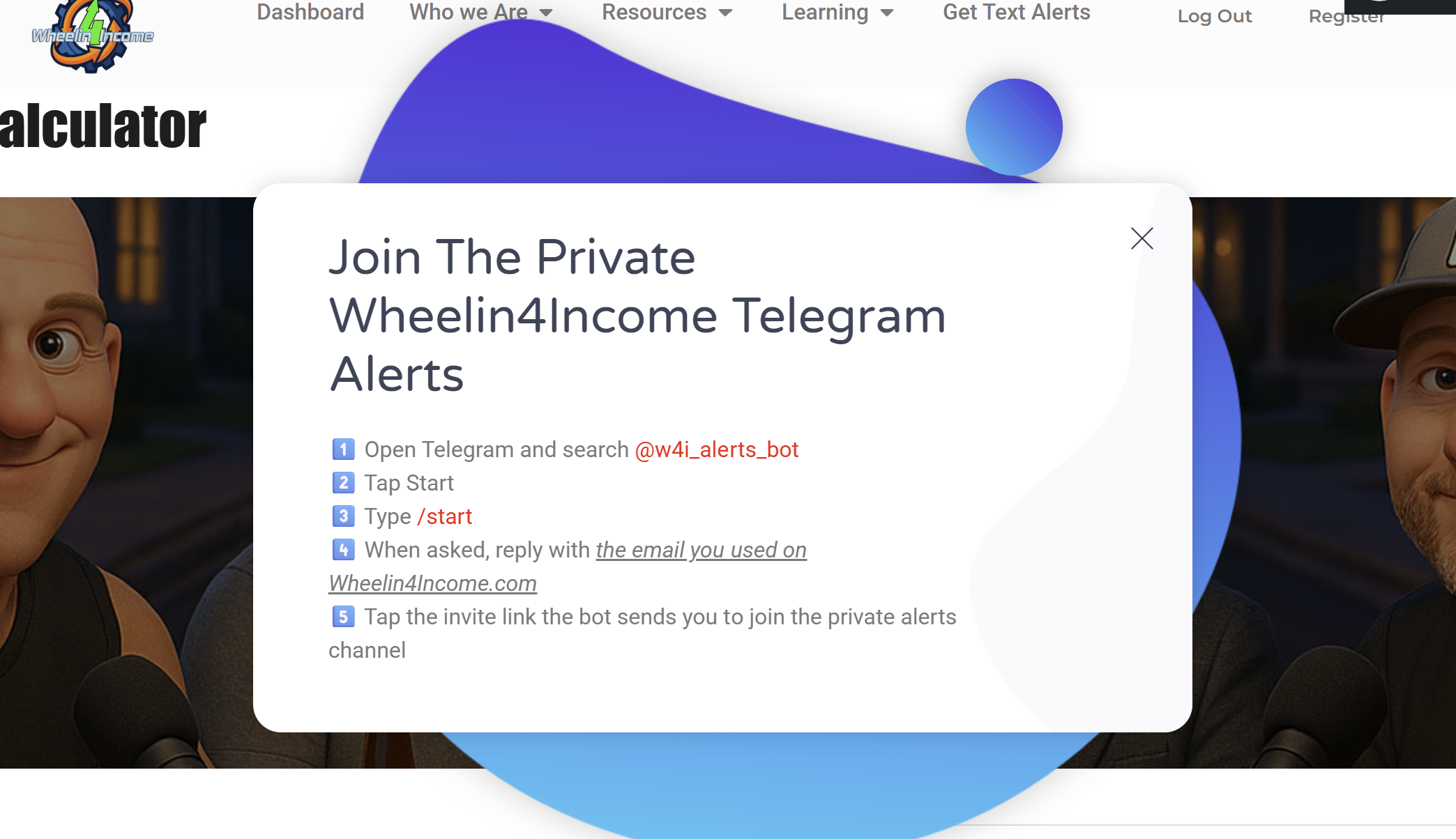 1️⃣ Open Telegram and search @w4i_alerts_bot 2️⃣ Tap Start 3️⃣ Type /start 4️⃣ When asked, reply with the email you used on Wheelin4Income.com 5️⃣ Tap the invite link the bot sends you to join the private alerts channel